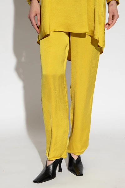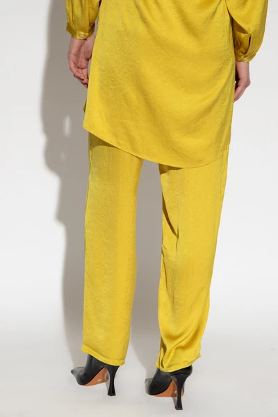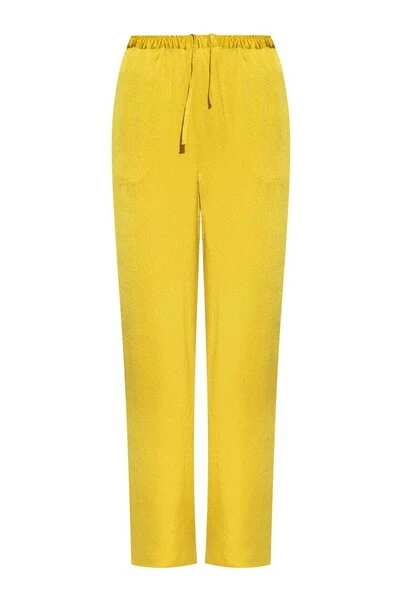 Groenachtige gele broek van American Vintage. Dit paar valt met brede benen en beschikt over een tailleband van trekkoord en twee slipzakken.
