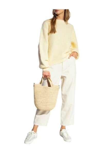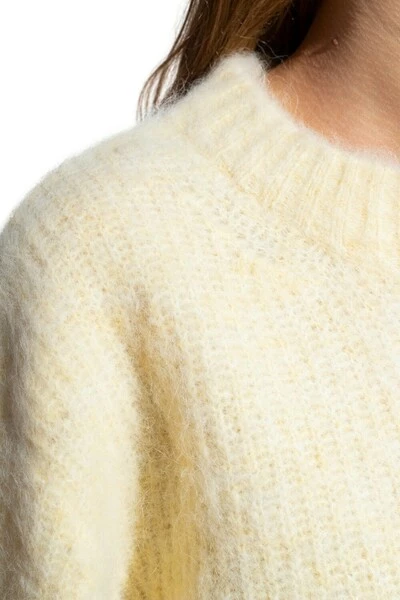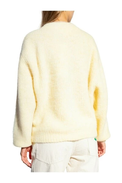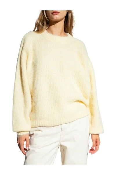 Lichtgele loszittende trui van American Vintage. Dit kledingstuk is gedeeltelijk gemaakt van Alpaca -wol en heeft een geribbelde ronde nek, zoom en manchetten.