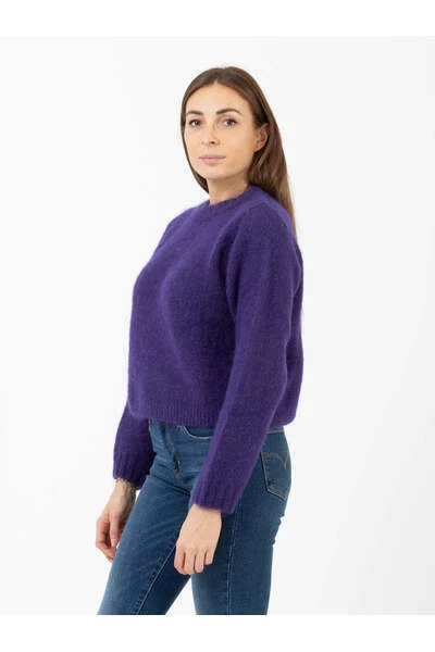 De Amerikaanse vintagecapo trui geborsteld in mohair gemengd. Girocollo, lange mouwen. Collo, polsen en ribben achtergrond. Paars 53% mohair 45% polyamide 2% elastaan Het model is 175 cm lang en draagt de s
