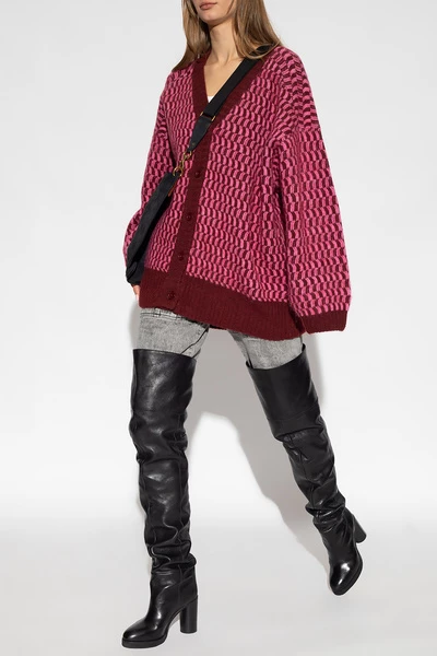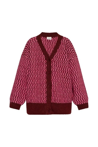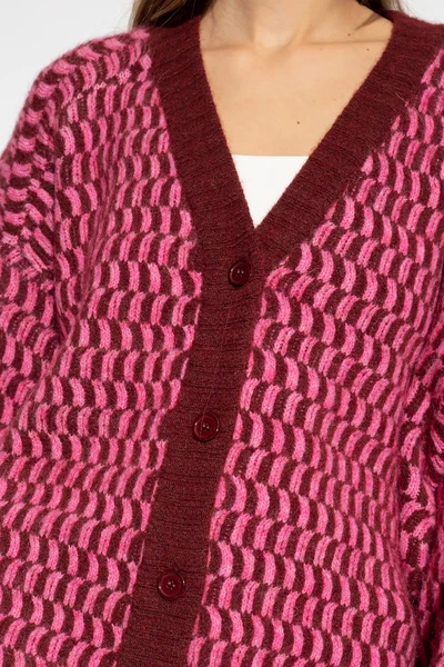 Roze en kastanjebruine vest van American Vintage. Deze stijl is vervaardigd van een schapenwol en alpaca-wolmix en heeft een ontspannen pasvorm, een gecontroleerd patroon, knoopbevestigingen en een elastische V-hals, onder zoom en manchetten.